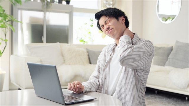 パソコン作業をしている時の姿勢を思い出してみてください。知らず知らずのうちに、画面に顔を近づけるように首が前に出ていませんか。この姿勢を続けると、首から肩にかけての筋肉は常に引き伸ばされた状態で緊張を強いられます。さらに、キーボードやマウスを操作する際に肩が前に巻き込む姿勢も加わると、背中の筋肉にも余計な負担がかかってきます。